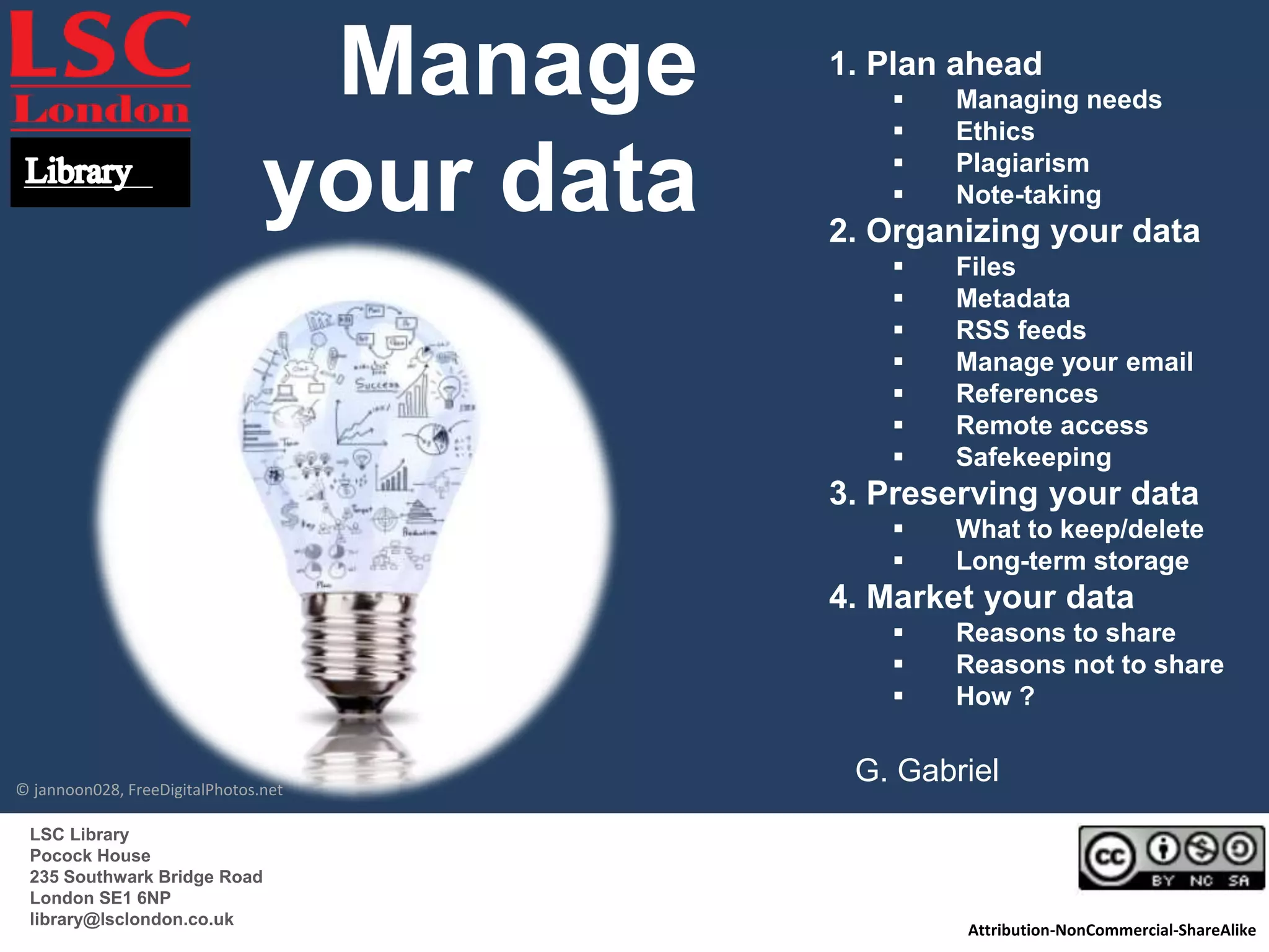 This document provides guidance on managing research data. It discusses planning ahead to consider data needs, formats, and volume. It emphasizes organizing data through file naming, metadata, references, email, and remote access. It stresses preserving data by determining what to keep/delete, using long-term storage such as repositories or archives. Finally, it examines reasons to share data such as scientific integrity, funding mandates, and increasing impact and collaboration.
