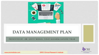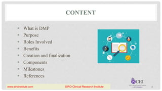 The document outlines the components and significance of a Data Management Plan (DMP) for clinical trials, detailing its purpose, creation process, involved roles, and benefits such as ensuring compliance and quality of data management. It emphasizes that the DMP should be a dynamic document that captures changes throughout the study's lifecycle and must be approved by responsible parties before the study begins. Additionally, the document lists essential components for a DMP, including protocol summary, personnel identification, timelines, and data management processes.