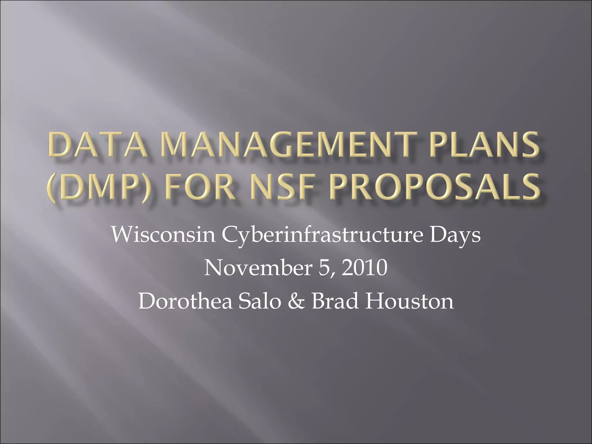The document discusses requirements for data management plans from the National Science Foundation. It notes that as of January 2011, NSF will require a data management plan for all new grant proposals as well as existing grants. The plan must address what data will be collected and how it will be organized, preserved, shared, and accessed. It emphasizes the importance of effective data management for facilitating research by both the principal investigators and other researchers. The document provides guidance on developing a data management plan that meets NSF's criteria and effectively manages research data.