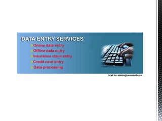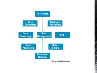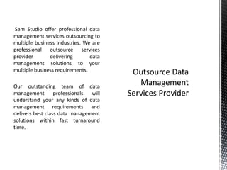 Sam Studio offers professional data management services for various business industries, including data entry, conversion, and analysis. Their services ensure data is securely managed and easily accessible, employing skilled professionals in data processing and data mining. The company aims to deliver accurate and timely solutions tailored to meet diverse business needs.