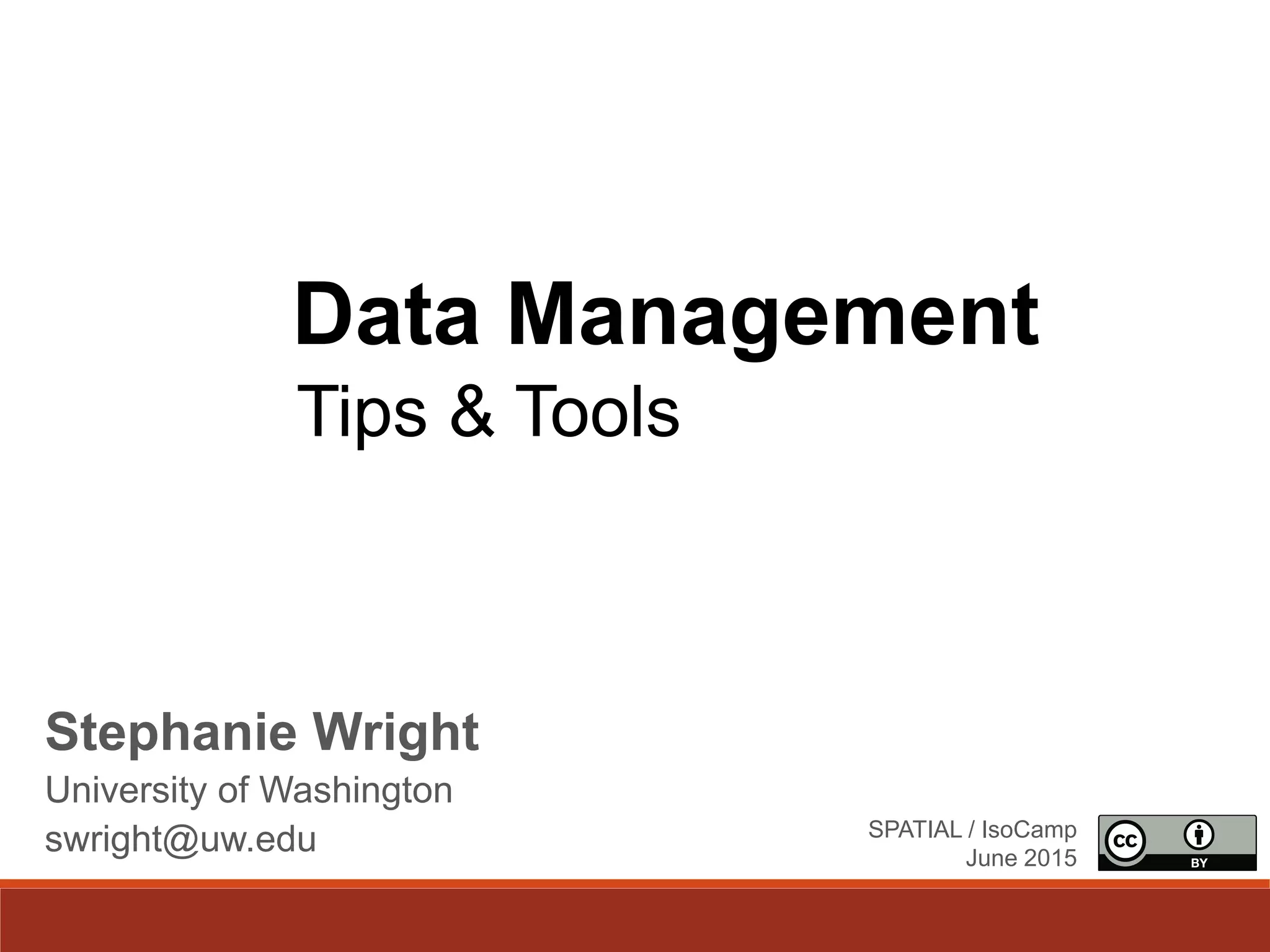 The document outlines data management practices and tools presented by Stephanie Wright from the University of Washington at a Spatial/ISOCamp event in June 2015. It emphasizes the importance of data management planning, sharing, and organization, providing concrete examples and resources for effective data handling in research. Additionally, it highlights the necessity of compliance with federal policies on public access to research data and offers numerous related learning resources.