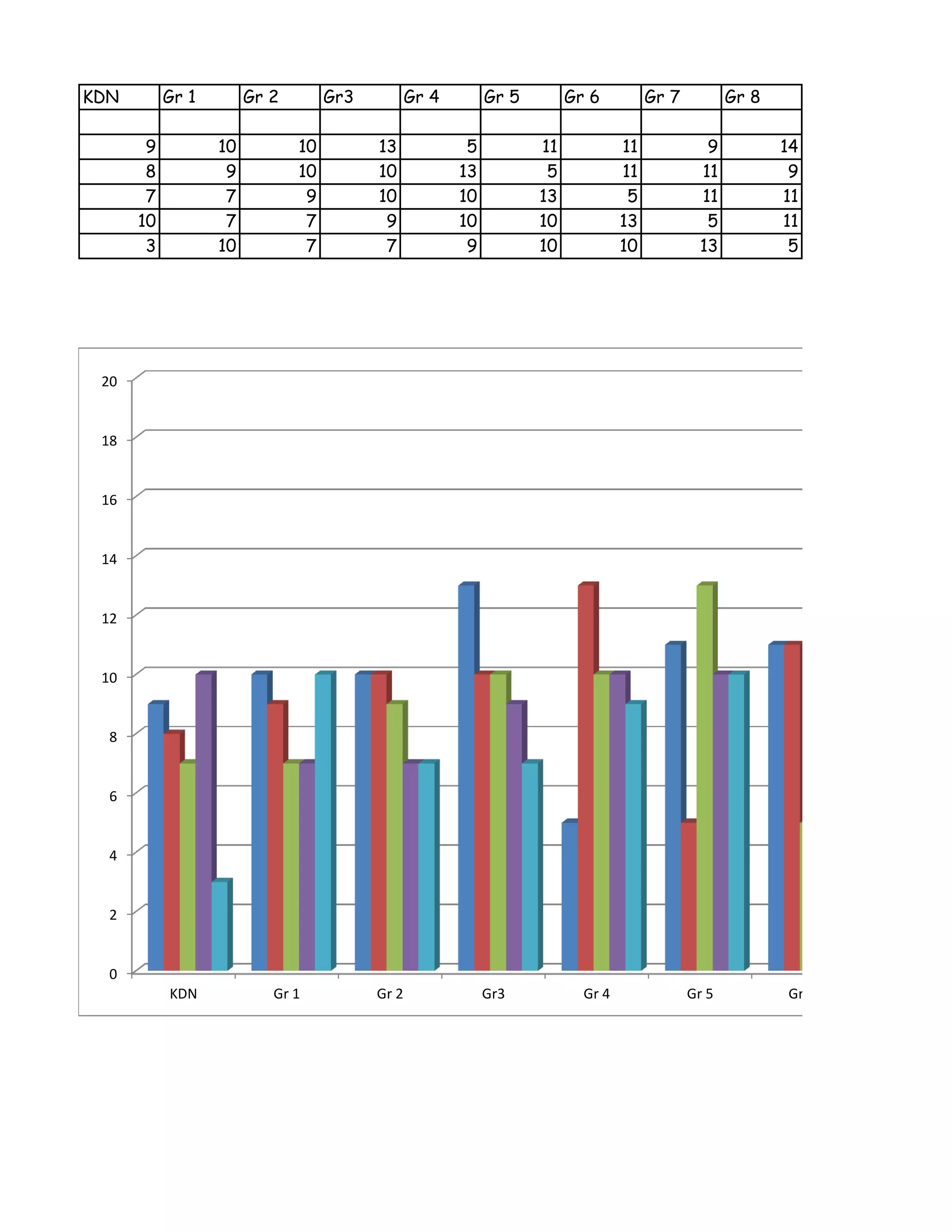 The document contains data on student enrollment numbers across multiple grades and schools over several years: