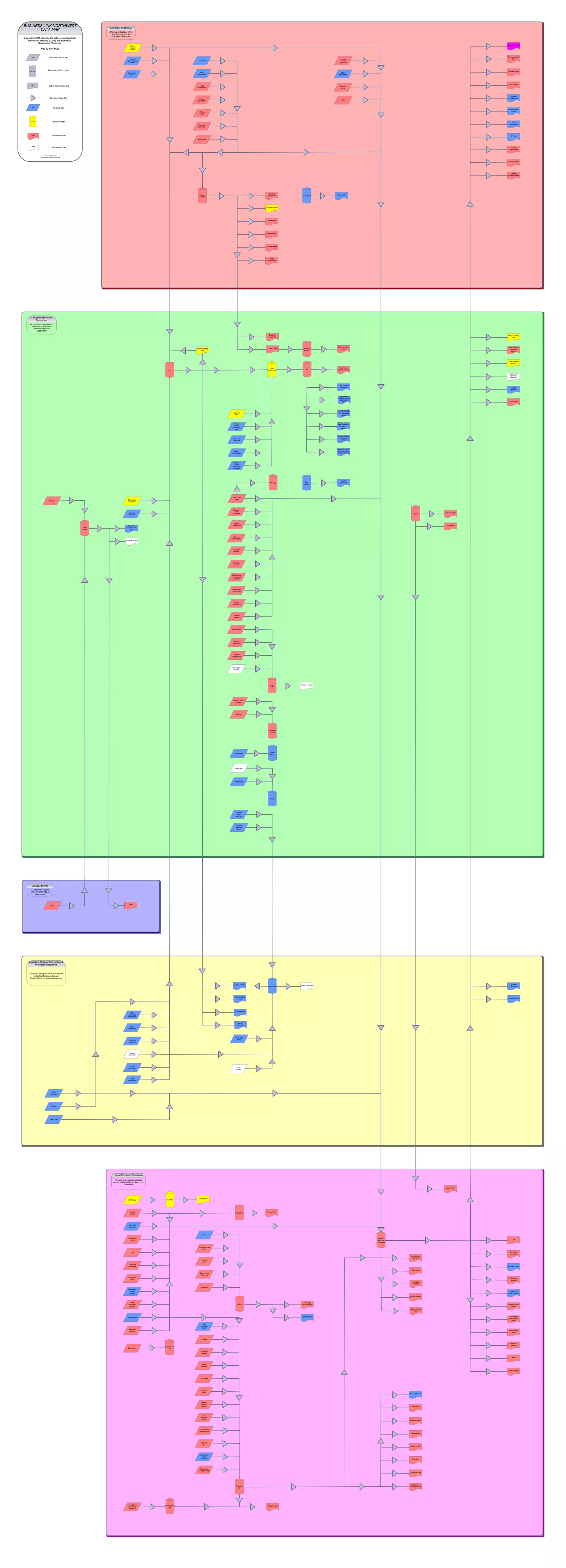 The document provides a data map of inputs and outputs related to the Operations Department of Business Link Northwest. The map shows the flow of various types of data through the department, including personal data, sensitive data, confidential data, and unclassified data. Arrows indicate the direction of data flow between different databases, documents, and external sources of information. The key explains symbols used on the map.