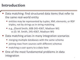 This document discusses data matching techniques. It begins with an introduction to data matching and its goals. The rest of the document is outlined as follows: problem definition, rule-based matching, learning-based matching, matching by clustering, probabilistic approaches, collective matching, and scaling data matching. Bayesian networks are presented as a probabilistic model for data matching. They provide a compact representation of probability distributions and allow reasoning under uncertainty. Learning Bayesian networks from training data is also discussed.
