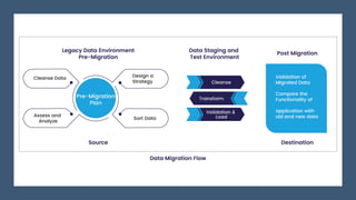 The document discusses data migration, which is defined as transferring data between different file formats, databases, or storage systems. It outlines requirements for data migration like ensuring data quality and type consistency. The types of data migration include application migration, cloud migration, and storage migration. The process involves pre-migration planning and assessment, data collection and cleansing, validation, and migration. Benefits are improved consistency and responsiveness, while challenges include dealing with legacy systems and resolving data redundancy across multiple sources. Careful planning is needed to avoid issues from unplanned migration.