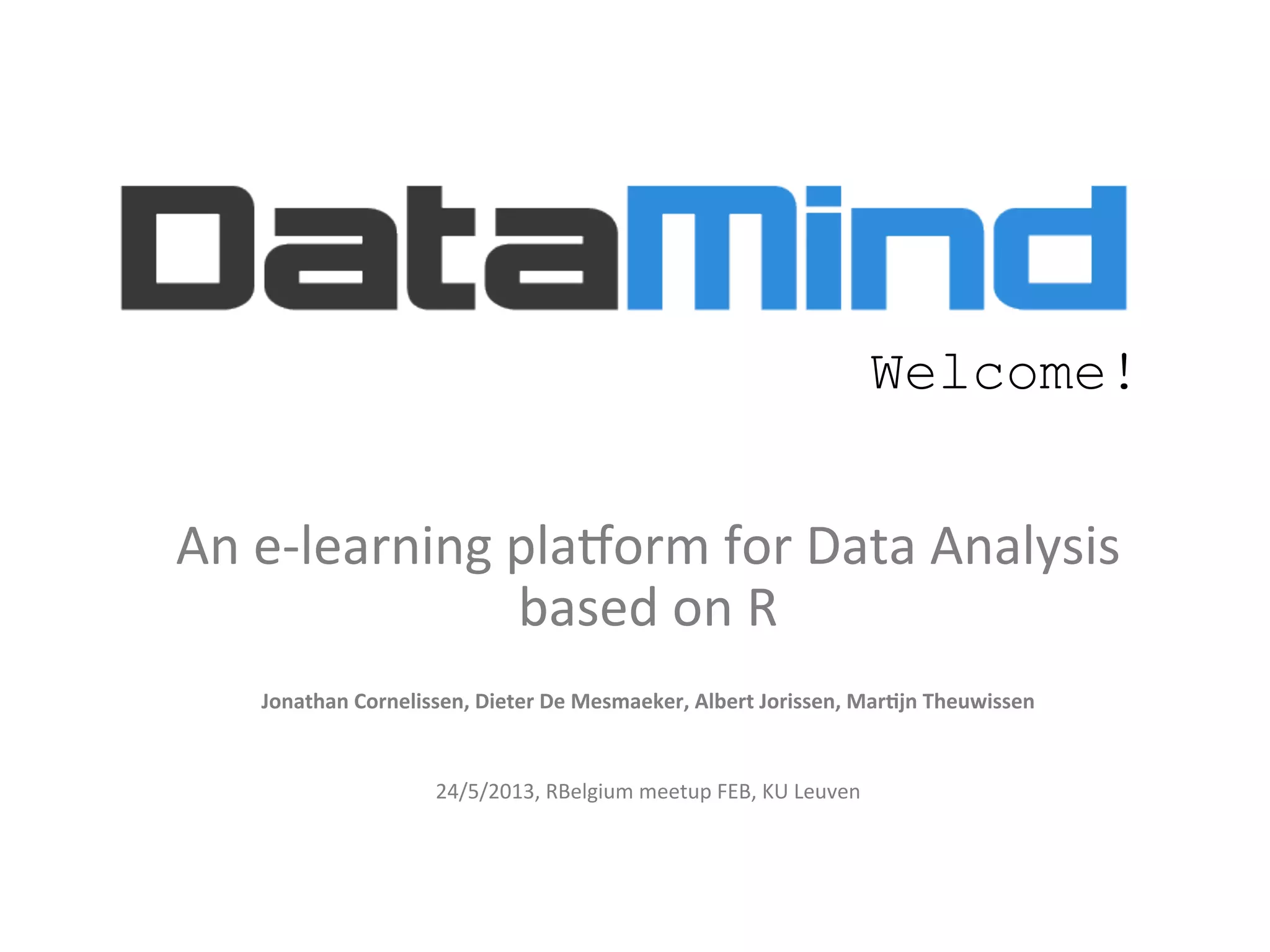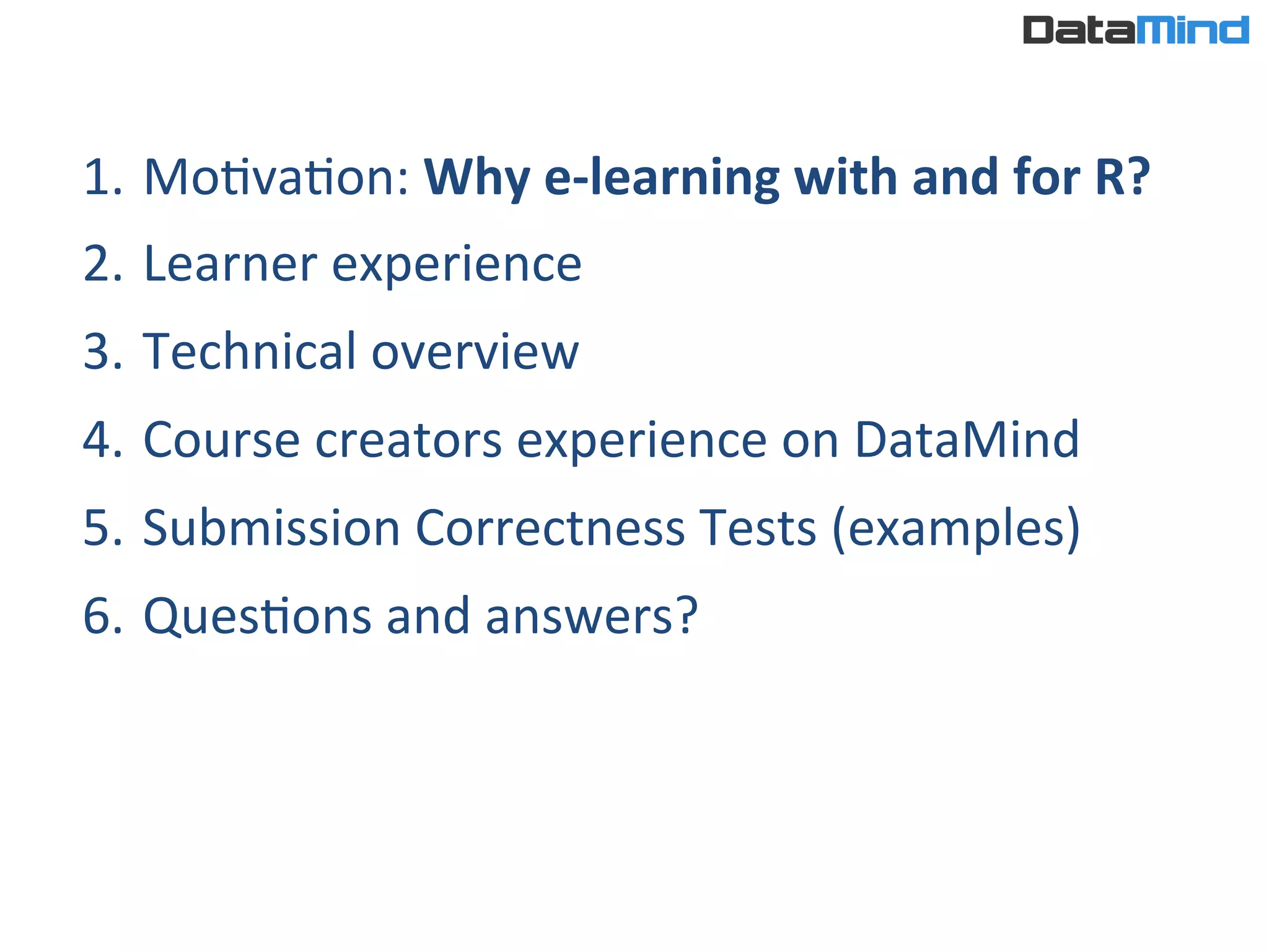 The document discusses the development of an e-learning platform, Datamind, aimed at teaching R and data analysis, highlighting the growing need due to the increasing R user base. It emphasizes the importance of interactive learning, automated feedback through submission correctness tests, and gamification to enhance student engagement and learning outcomes. Additionally, the document outlines the technical architecture of the platform and the benefits for both learners and course creators in creating and delivering educational content.