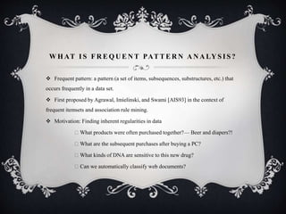 Frequent pattern mining is an important data mining task that finds patterns that frequently occur together in a dataset. The Apriori algorithm is an influential method that uses candidate generation and testing to iteratively find frequent itemsets. It involves multiple scans of a transaction database and generates a huge number of candidate patterns, posing challenges to scalability. Other methods like frequent pattern growth and vertical format approaches aim to reduce database scans and shrink the number of candidates to mine frequent patterns more efficiently.