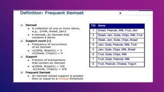 This document provides an introduction to data mining concepts including definitions, tasks, challenges, and techniques. It discusses data mining definitions, the data mining process including data preprocessing steps like cleaning, integration, transformation and reduction. It also covers common data mining tasks like classification, clustering, association rule mining and the Apriori algorithm. Overall, the document serves as a high-level overview of key data mining concepts and methods.
