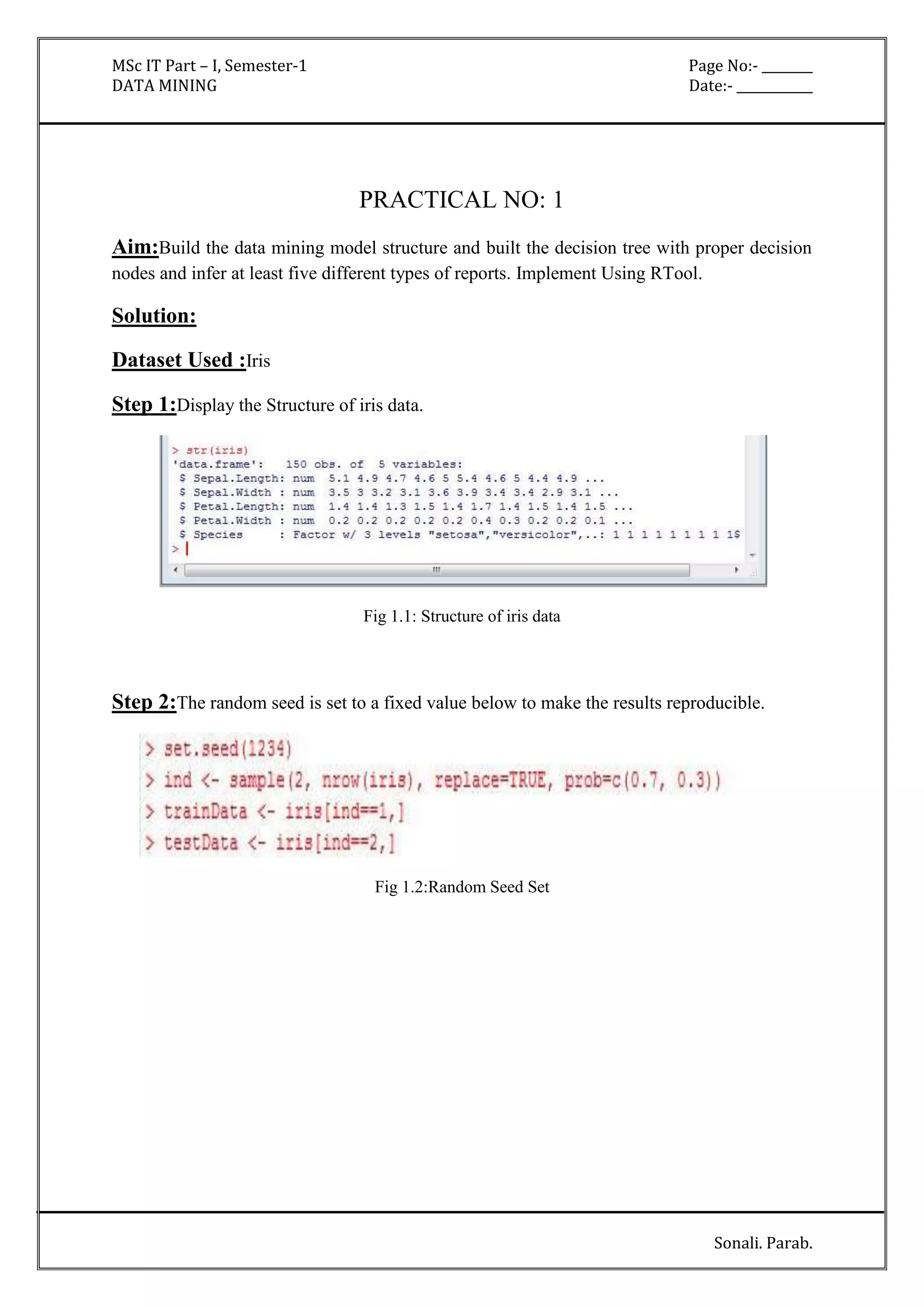 The document outlines various practical assignments for a Data Mining course using different datasets and tools like R and Weka. Each practical involves building models using algorithms such as decision trees, naive Bayes, k-nearest neighbors, and clustering techniques along with steps for data preprocessing and visualization. Key datasets include iris, diabetes, bodyfat, and contact lenses, with reports generated to analyze results.