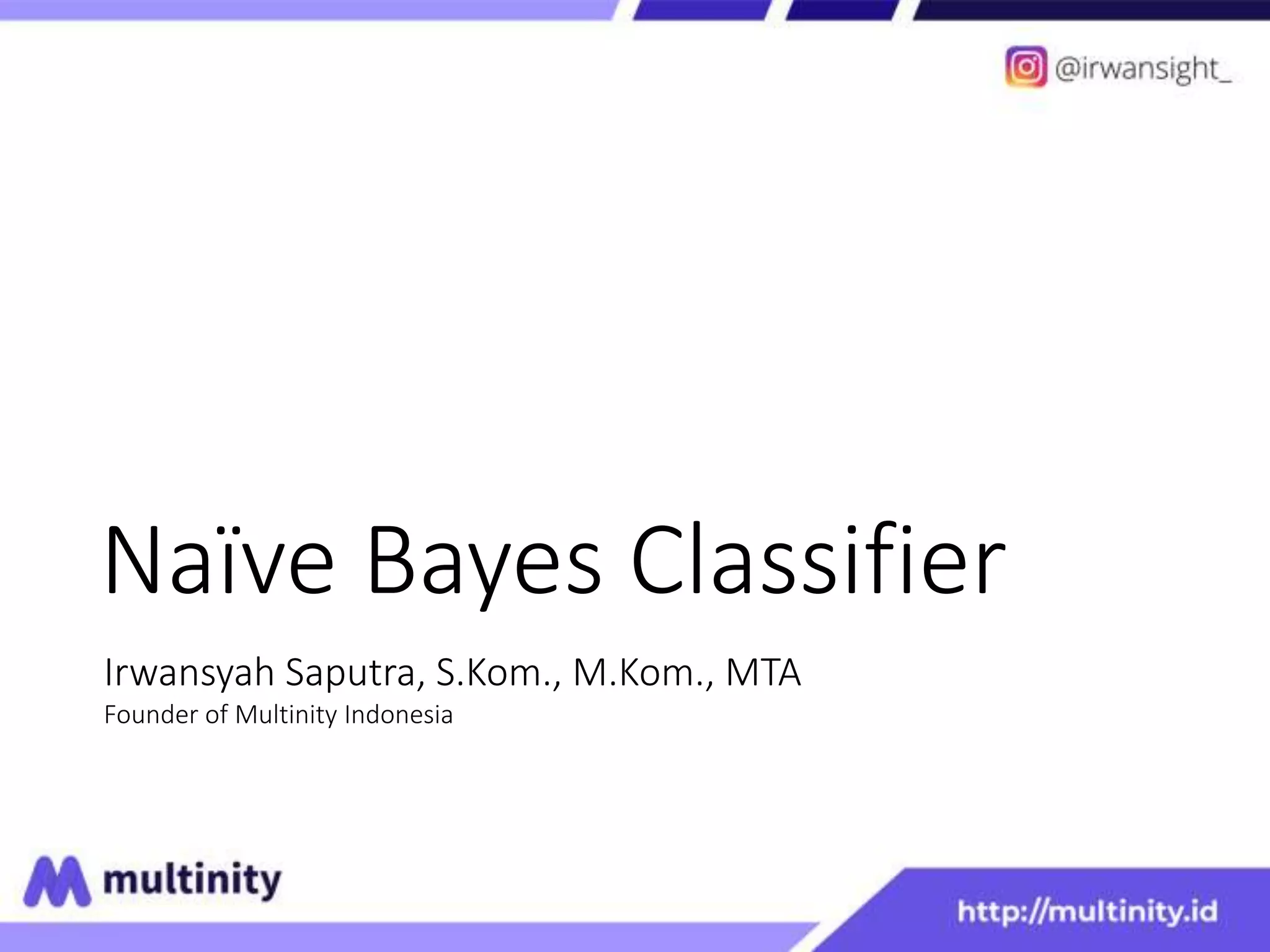 The document discusses the Naive Bayes classifier. It begins with an introduction to probability and defines the formula for Naive Bayes classification. It then provides an example dataset to demonstrate how to calculate the probabilities of each attribute value belonging to each class. The example shows calculating the probabilities for attributes like major, gender, school origin, GPA, and assistant status to predict whether a student's study duration will be on time or late.