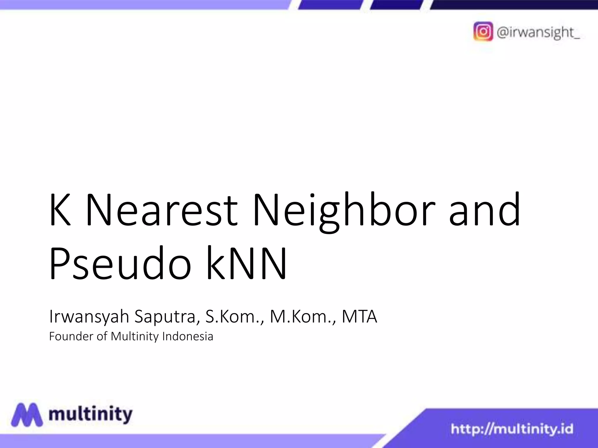 This document discusses K Nearest Neighbor and Pseudo kNN algorithms. It begins with an introduction to KNN, explaining that KNN classifies new data based on the labels of the K nearest neighbors. It then provides an example using a nutrition dataset to classify a new data point as either obese or ideal. For KNN, it calculates the distances to each data point and determines the label based on the labels of the K closest points. Pseudo KNN is similar but considers the K closest points within each class separately before determining the overall label.
