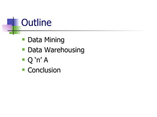 Data mining and data warehousing have evolved since the 1960s due to increases in data collection and storage. Data mining automates the extraction of patterns and knowledge from large databases. It uses predictive and descriptive models like classification, clustering, and association rule mining. The data mining process involves problem definition, data preparation, model building, evaluation, and deployment. Data warehouses integrate data from multiple sources for analysis and decision making. They are large, subject-oriented databases designed for querying and analysis rather than transactions. Data warehousing addresses the need to consolidate organizational data spread across various locations and systems.