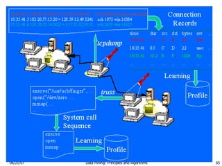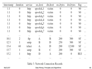 The document discusses using data mining approaches for intrusion detection. It describes current intrusion detection approaches like misuse detection using signatures of known attacks and anomaly detection using deviations from normal behavior profiles. Data mining can help by providing a systematic framework to select relevant audit data features, build and update detection models, and combine multiple models. Relevant techniques include building classifiers from audit data and mining patterns within audit records.