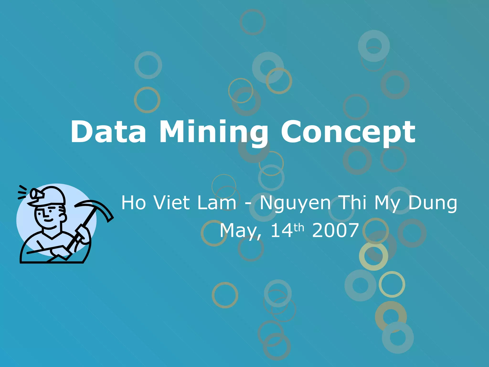 The document provides an overview of data mining concepts including association rules, classification, clustering, and applications of data mining. It discusses association rule mining algorithms like Apriori and FP-growth, decision tree algorithms for classification, and K-means clustering. Commercial data mining tools from companies like Oracle, SAS, and IBM are also mentioned. The document concludes that data mining can be used to discover patterns in many types of data and the results may include association rules, sequential patterns, and classification trees.