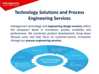 Intelegencia provides technology solutions, process engineering, and outsourcing services with a focus on innovation and customer-centric design. They offer quality engineering and assurance through software testing, big data analytics for business intelligence, secure cloud infrastructure, and comprehensive business process outsourcing services. The company is located in Philadelphia and can be contacted through their website or phone.