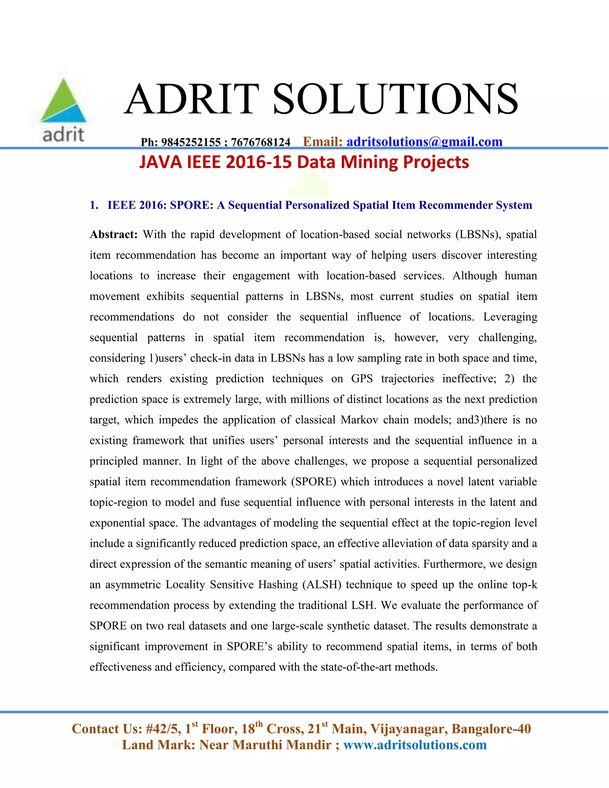 The document outlines various research projects presented at IEEE conferences, focusing on advancements in areas like spatial item recommendation, spatial keyword search, and truth discovery in crowdsourced data. Notable projects include developing frameworks for real-time recommendations based on user locations, efficient querying of spatio-textual data, and detecting malicious applications on social media. Other significant highlights involve multi-keyword ranked searches over encrypted data and smart crawlers for harvesting deep web interfaces.