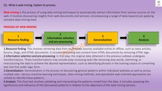 The document discusses key concepts in web and text mining, focusing on processes such as resource finding, information selection, generalization, and analysis. It elaborates on algorithms like HITS and PageRank, describing their usage in determining webpage importance and extracting insights from unstructured text data. Additionally, it categorizes data types and highlights the significance of text mining tools in improving organizational decision-making.