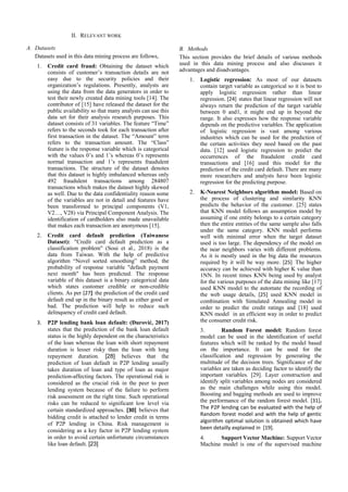 This document outlines a project focused on applying various data mining methods to three fintech-related datasets to derive insights and predict financial risks such as credit card fraud and defaults. The study employs techniques like logistic regression, k-nearest neighbors, random forest, and support vector machines, following established methodologies like KDD and CRISP-DM to assess and compare algorithm performance. The paper emphasizes the importance of data mining in enhancing financial risk management and improving service delivery in the fintech sector.