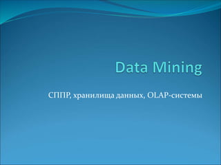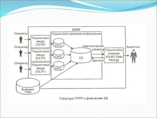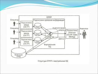 Документ охватывает технологии Data Mining и DSS (системы поддержки принятия решений), подчеркивая их важность в анализе данных и сделав акцент на необходимость квалификации аналитиков. Он также описывает хранилища данных, их архитектуру и информационные потоки, а также различия между OLAP-системами (MOLAP, ROLAP, HOLAP) с учетом их характеристик и применения. В документе рассматриваются задачи анализа данных и методы очистки данных в контексте эффективного управления данными.