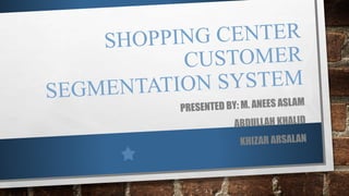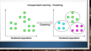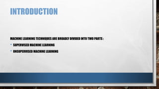 This document discusses supervised and unsupervised machine learning techniques. Supervised learning uses labeled training data to learn classifications and regressions, while unsupervised learning finds hidden patterns in unlabeled data through techniques like clustering. It provides k-means clustering as an example of unsupervised learning, where the algorithm divides data into a predefined number of clusters based on similarity. The document proposes using k-means clustering on customer data from a supermarket mall to segment customers into groups to help with marketing strategy.