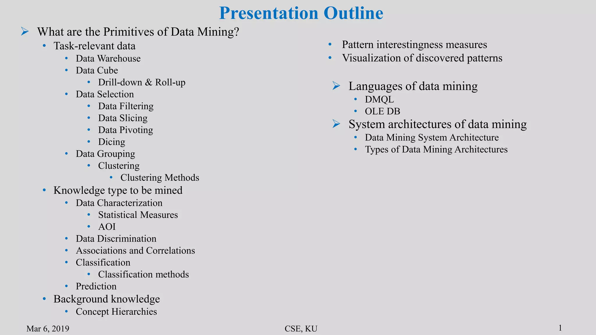 The document summarizes the key primitives and concepts in data mining. It discusses the main primitives as task-relevant data, knowledge types to be mined, and background knowledge. It describes various data mining techniques including data selection, grouping, characterization, discrimination, associations and correlations. It also discusses classification methods and prediction. Finally, it covers data mining system architectures and languages such as DMQL and OLE DB.