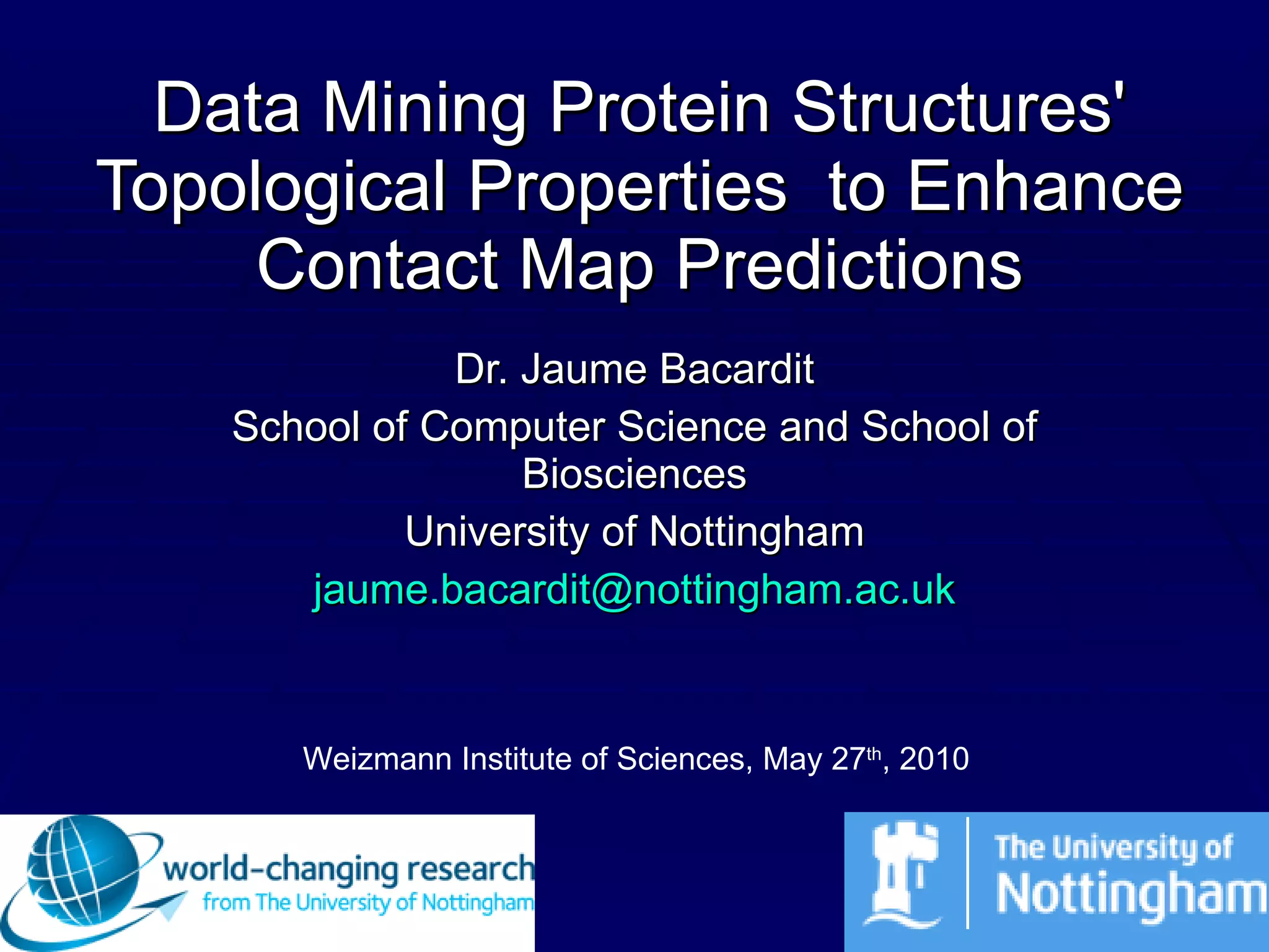 1. The document discusses a contact map prediction method that was one of the top performers in CASP8. It uses topological properties of proteins like recursive convex hulls along with machine learning to predict contacts.