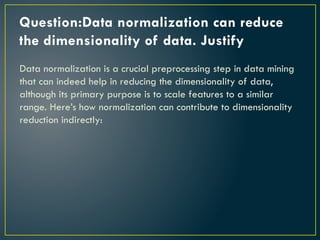 Question:Data normalization canreduce the dimensionality of data. Justify Data normalization is a crucial preprocessing step in data mining that can indeed help in reducing the dimensionality of data, although its primary purpose is to scale features to a similar range. Here’s how normalization can contribute to dimensionality reduction indirectly: