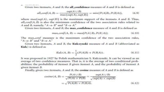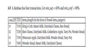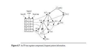 This document discusses various techniques for association rule mining, including frequent pattern mining. It defines key concepts like support, confidence, frequent itemsets, and association rules. It describes the Apriori algorithm for mining frequent itemsets and generating association rules. It also introduces FP-Growth as an alternative approach that avoids candidate generation through the use of an FP-tree to compress the transaction database. The document provides examples to illustrate frequent and maximal frequent itemsets.
