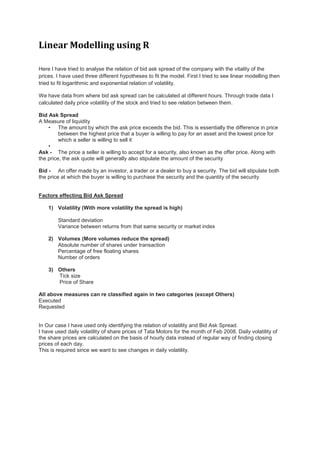 This document discusses two data mining techniques: linear modelling using R and clustering using WEKA. For linear modelling in R, the author analyzes the relationship between bid-ask spread of a company's stock and price volatility. Clustering in WEKA is demonstrated by segmenting customers based on their shopping attitudes using k-means clustering. The author finds that bid-ask spread does not have a linear or logarithmic relationship with volatility based on their analysis in R.