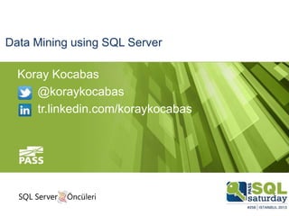 This document discusses data mining using SQL Server. It outlines different data mining algorithms and their purposes, such as using decision trees to predict discrete or continuous attributes, and clustering algorithms to find groups of similar items. It also mentions demo examples on forecasting sales and analyzing Facebook and Ülker customer data. The document promotes the #sqlsatistanbul conference and provides contact information for the speaker.