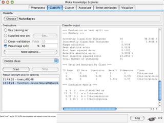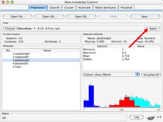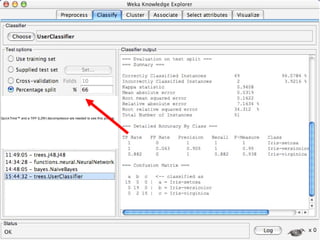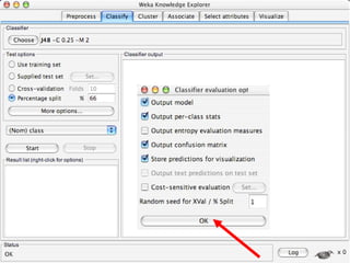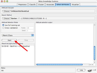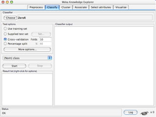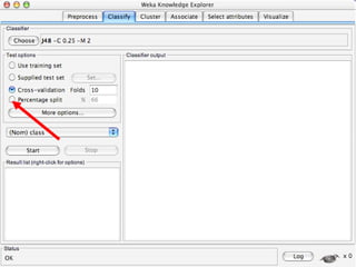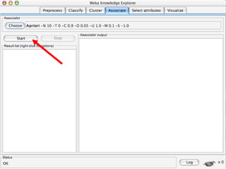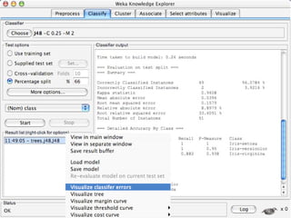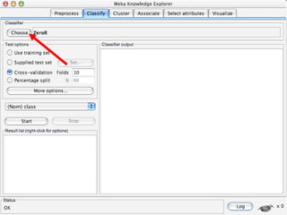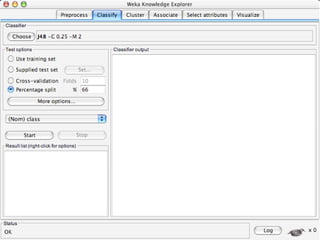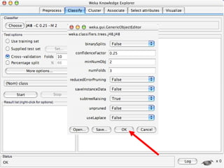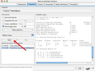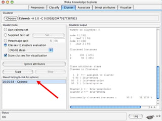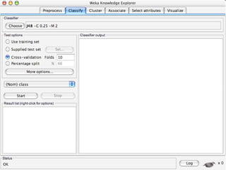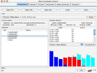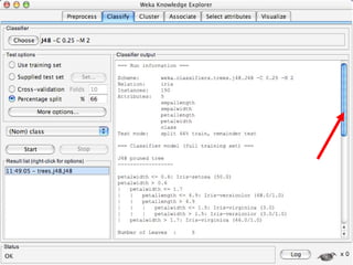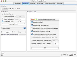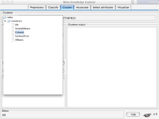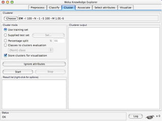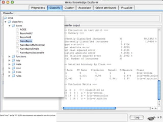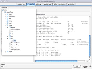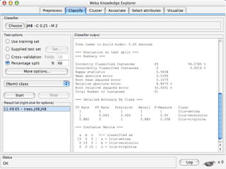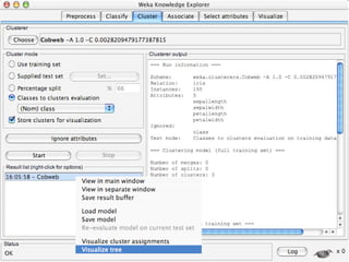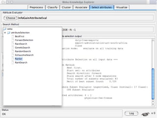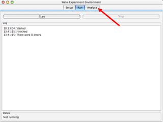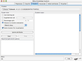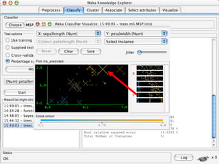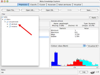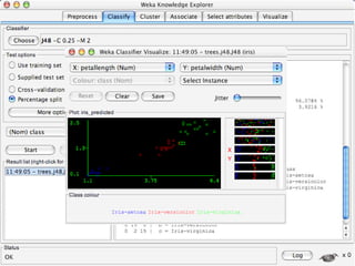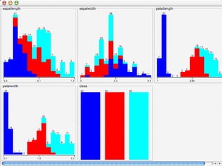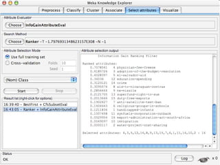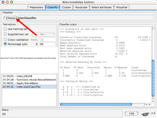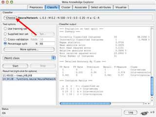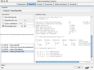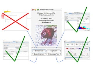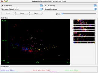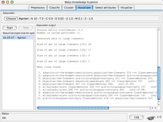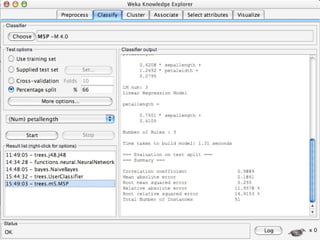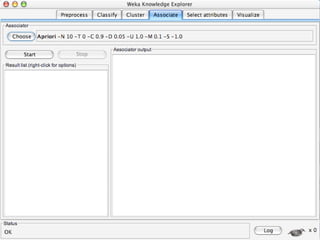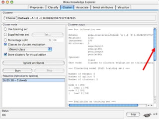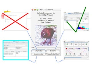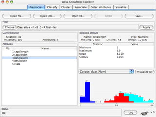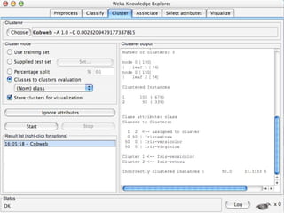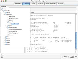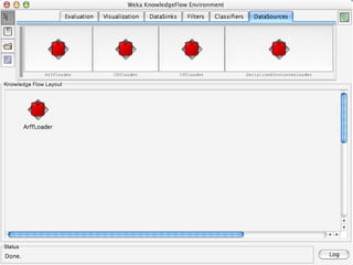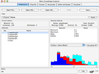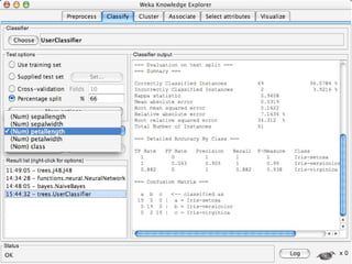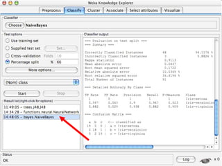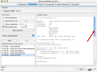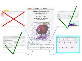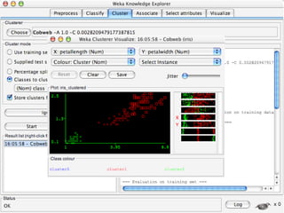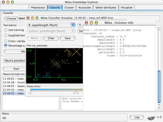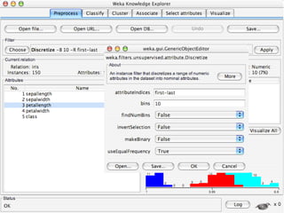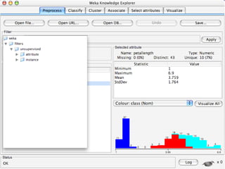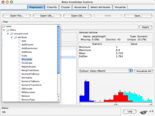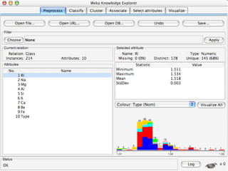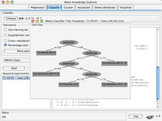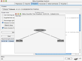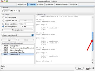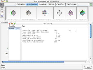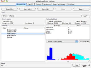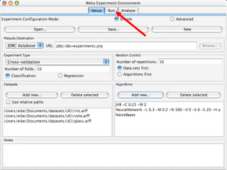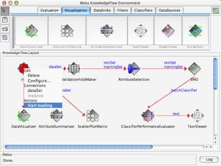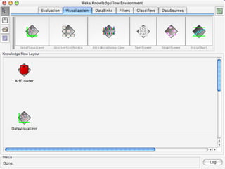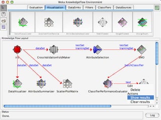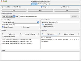 WEKA is machine learning software written in Java that is used for data mining tasks. It contains tools for pre-processing data, building classifiers, clustering data, finding associations, attribute selection, and visualizing data. WEKA also allows users to perform experiments to compare the performance of different learning algorithms on classification and regression problems. It has graphical user interfaces that make it easy to set up and run machine learning experiments by connecting different components in a workflow.