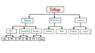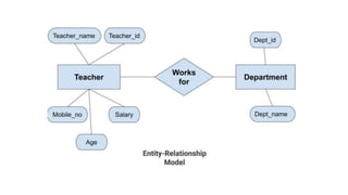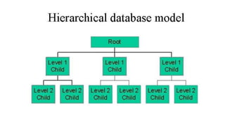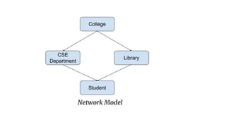 The document discusses different data models including hierarchical, network, entity-relationship, relational, and object-oriented models. It provides details on each model such as their structure, advantages, and disadvantages. The hierarchical model organizes data in a tree structure while the network model extends the hierarchical model by allowing a record to have more than one parent. The entity-relationship model represents data using entities, attributes, and relationships. The relational model stores data in tables and relations. Finally, the object-oriented model represents both data and relationships within a single object structure.