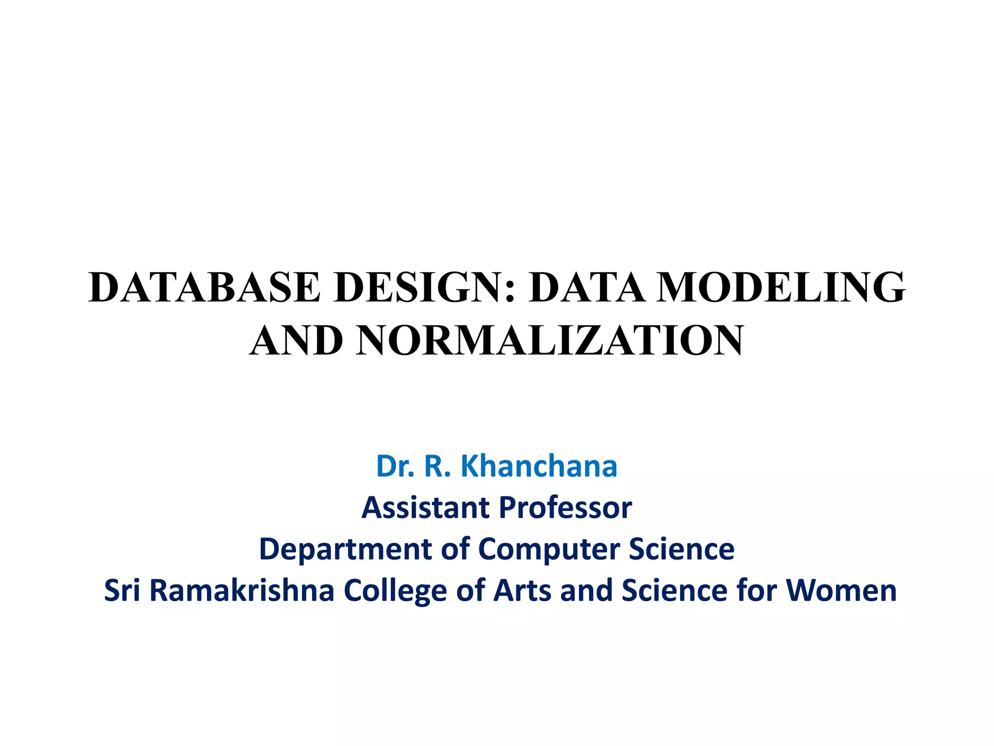 This document discusses database design and data modeling concepts. It covers: