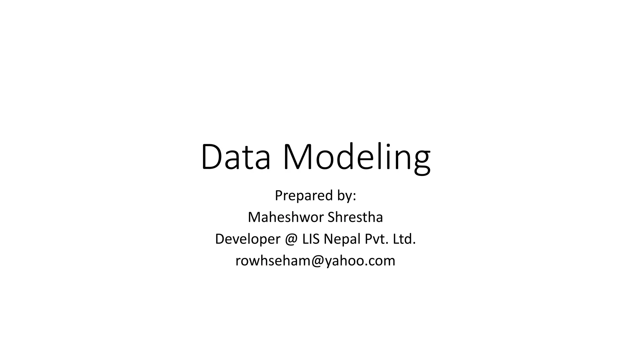 This document provides an overview of data modeling. It discusses the introduction to data modeling, examples of data models like a retail data model, the steps in data modeling including requirement gathering, conceptual, logical, and physical modeling, types of data models like operational and data warehouse, stakeholders in data modeling, and tools that can be used for data modeling.