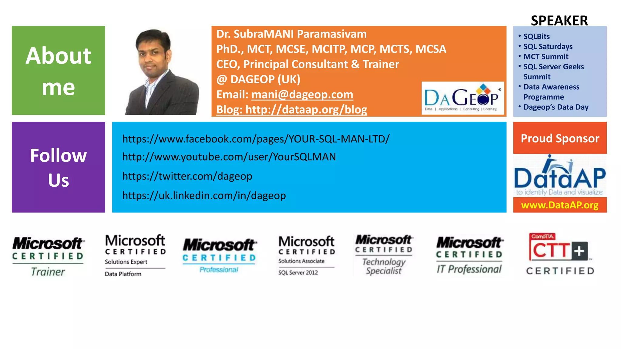 Dr. SubraMANI Paramasivam is a CEO and principal consultant with extensive experience in data modeling. He discusses X-Events in SQL Server, which provide efficient event handling and monitoring with low system resource usage. The document demonstrates how to build packages to contain events, actions, targets, and predicates in X-Events. It also shows how to capture event data to an XML file target and analyze the results to find long-running queries.