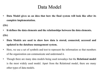 The document provides an overview of different data models including hierarchical, network, entity-relationship, relational, object-oriented, and object-relational models. It describes the key components and features of each model. Examples are given to illustrate concepts like entities, attributes, relationships, and how data can be organized in different structures. The advantages and disadvantages of each model are also discussed. Overall, the document serves as a useful introduction to the main data models used in database management systems.