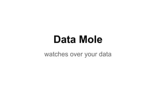 Data Mole is a service that analyzes customer metrics to detect unusual activity and alert analysts. It notifies customers if metrics decrease unexpectedly or if specific pages gain unusual traffic. This allows analysts to focus on growth rather than constantly monitoring dashboards. Data Mole integrates with Google Analytics and plans to partner with other companies to implement its algorithms more widely. It uses a freemium pricing model and aims to be more affordable and easier to use than competitors like Adobe SiteCatalyst or open source solutions.