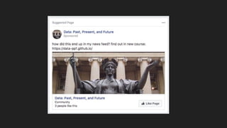 The document discusses the evolution of data, statistics, and technology from the 1770s to the present, highlighting their impact on social and political order. It emphasizes the historical influence of figures like Florence Nightingale on data visualization and the implications of data distribution on power dynamics. Additionally, it outlines the structure of a course that combines technical and humanistic approaches to data sciences.