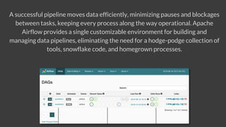The document discusses the book 'Data Pipelines with Apache Airflow', which focuses on efficient data pipeline management using Apache Airflow. It highlights the book's practical approach to simplifying and automating data workflows and contains endorsements from industry professionals. Additionally, readers can purchase the book at a discount using a specific code on the publisher's website.