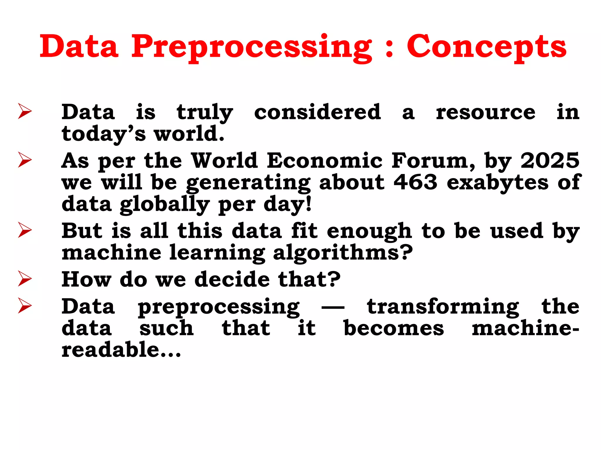 Data preprocessing transforms raw data into a format that is suitable for machine learning algorithms. It involves cleaning data by handling missing values, outliers, and inconsistencies. Dimensionality reduction techniques like principal component analysis are used to reduce the number of features by creating new features that are combinations of the originals. Feature encoding converts categorical features into numeric values that machines can understand through techniques like one-hot encoding. The goal of preprocessing is to prepare data so machine learning algorithms can more easily interpret features and patterns in the data.