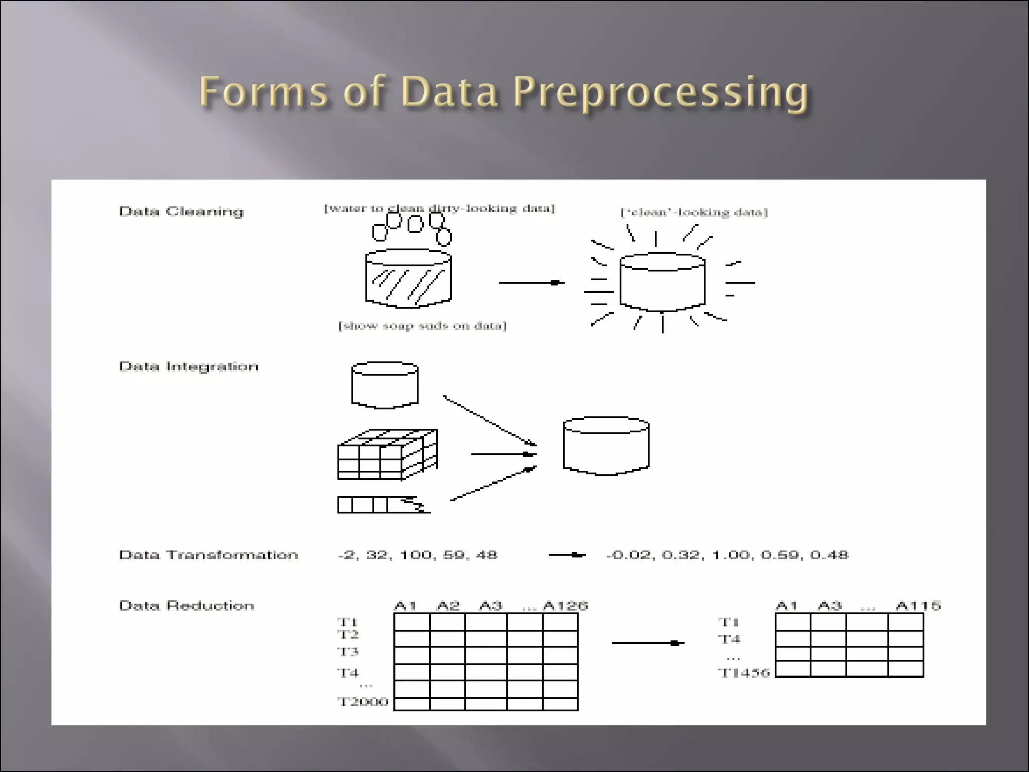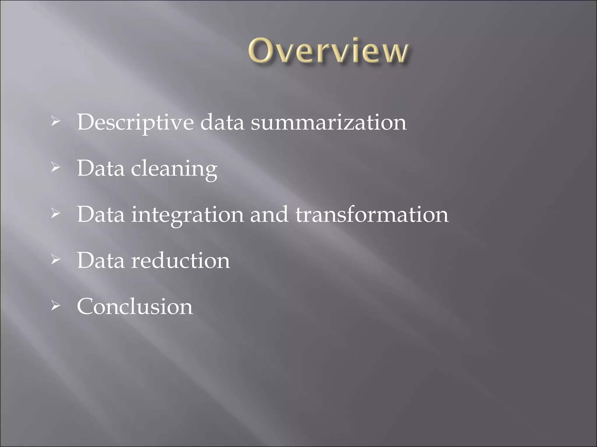 This document discusses data preparation techniques for data warehousing and mining projects, including descriptive data summarization, data cleaning, integration and transformation, and reduction. It covers cleaning techniques like handling missing data, identifying outliers, and resolving inconsistencies. Data integration challenges like schema matching and resolving conflicts are also addressed. Methods for data reduction like aggregation, generalization, normalization and attribute construction are summarized.