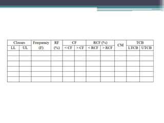 The document discusses three primary methods for presenting data: textual, tabular, and graphical, each suitable for specific contexts and types of data. It explains the components and construction techniques of frequency distribution tables (FDT) and highlights steps for creating grouped FDTs, including determining class intervals and tallying data. The importance of combining methods to effectively communicate data findings is emphasized throughout the material.