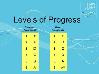 The document provides information about different metrics and terminology used to evaluate student progress and performance. It includes definitions of terms like average points score, average predicted grade, average target grade, and ALPS (Average GCSE point score linked to expected outcome). It also defines levels of attainment (lower, middle, higher tiers) and how to interpret UMS, UCAS, and SCATT scores. The key information is how to use the data - look for underperformance, trends, compare classes, consider residuals and prediction quality, and use it as a signpost for differentiation and sharing best practices rather than an end in itself.