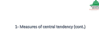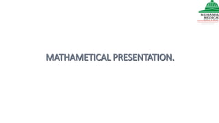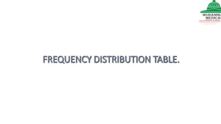 This document provides information on various methods of presenting data, including tabular, graphical, and textual presentation. It discusses principles of data presentation and different types of tables, charts, and diagrams that can be used including simple tables, frequency distribution tables, bar charts, histograms, line graphs and pie charts. It also covers concepts like class intervals, frequency, relative frequency and discusses worked examples of various methods of data presentation.