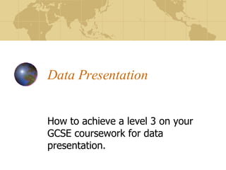 The document provides guidance on how to achieve a level 3 on a GCSE coursework for data presentation. It discusses using more complex techniques like graphs, statistical analysis, tables, and pictograms to present data. It emphasizes choosing techniques that are appropriate for the investigation and providing clear organization and labeling. Specific tips are provided for different graph types, common mistakes to avoid, and how to properly construct pictograms using accurate scales and keys. Examples of good and bad pictograms are included.