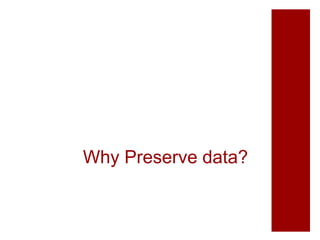 Digital data preservation involves planning and allocating resources to ensure digital information remains accessible and usable over time. It requires policies, strategies and preservation methods to ensure future access. The document outlines 13 ways to approach digital preservation, including as an ongoing activity that avoids crises through continuous effort rather than periodic bursts; as a cooperative effort across organizations to enhance funding; and as a selection process to determine what data is worth preserving given limits on storage. The conclusion notes that while the article outlines preservation approaches, it does not explain how to achieve preservation or select essential data to retain.