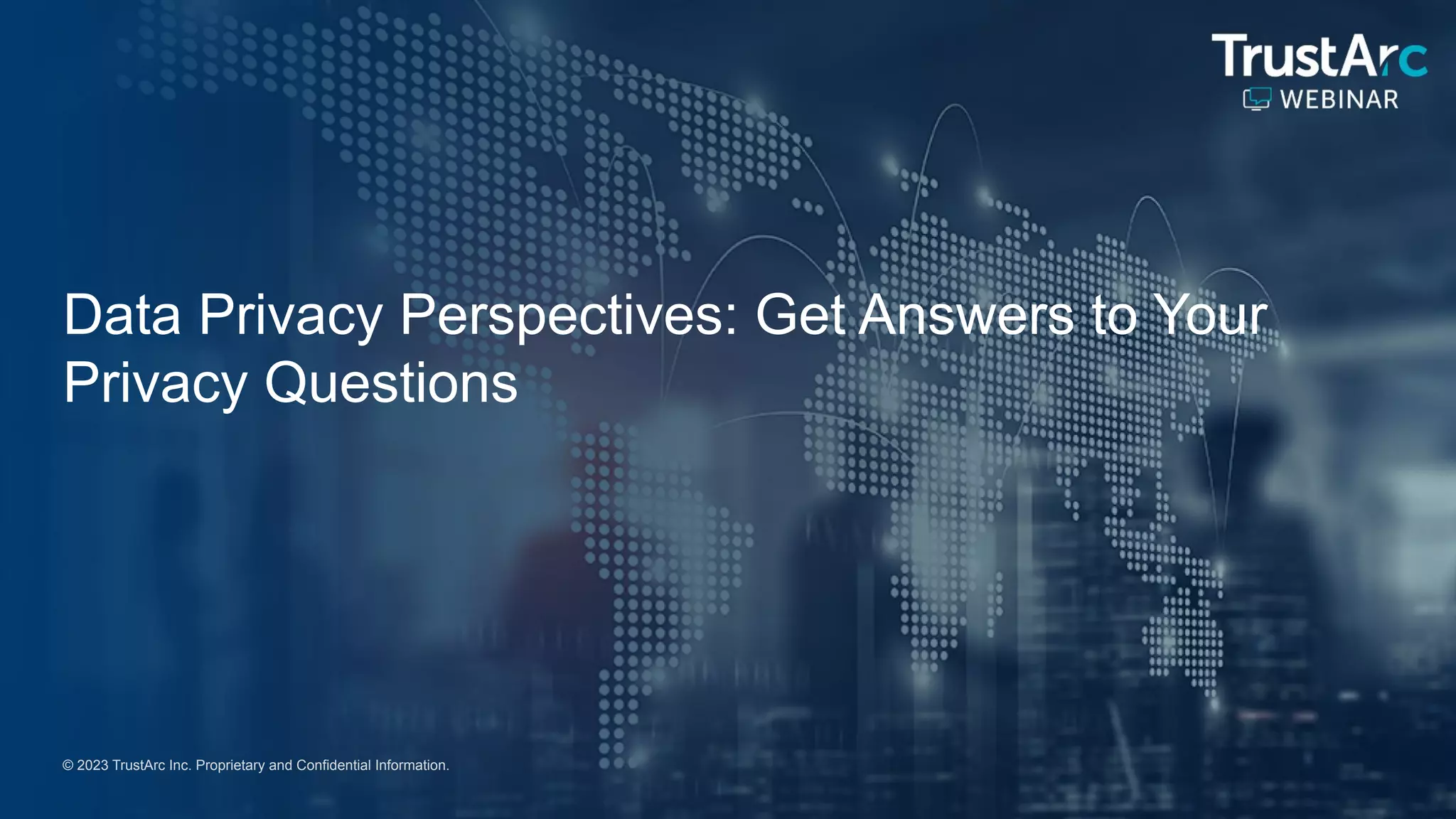 The document outlines details for a webinar titled 'Data Privacy Perspectives: Get Answers to Your Privacy Questions' featuring speakers from TrustArc. It mentions that the session will be recorded and questions can be submitted through a control panel. Additionally, it clarifies that the webinar does not constitute legal advice and provides contact information for further support.