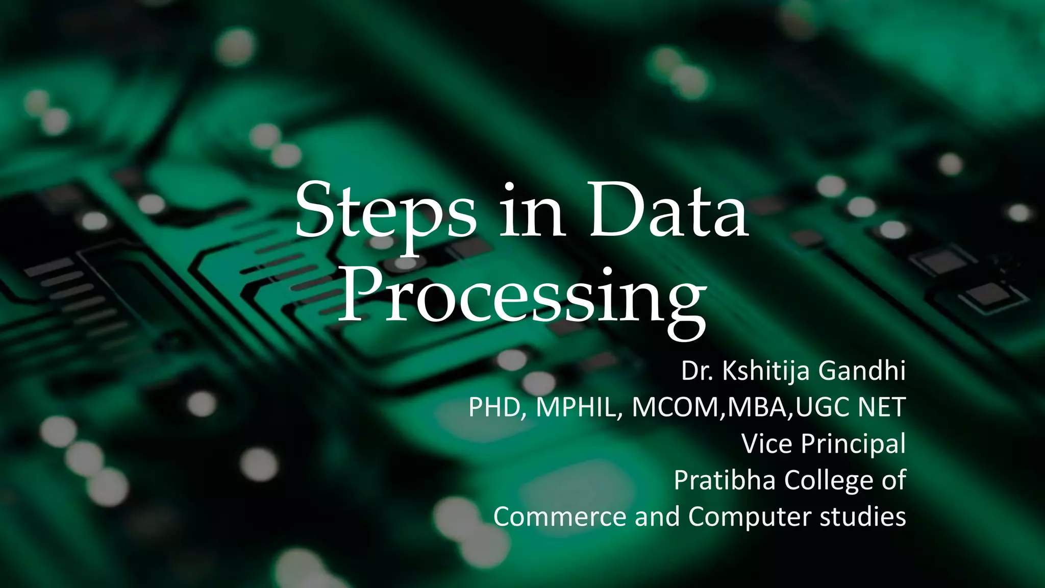 Steps in Data Processing Dr.Kshitija Gandhi PHD, MPHIL, MCOM,MBA,UGC NET Vice Principal Pratibha College of Commerce and Computer studies