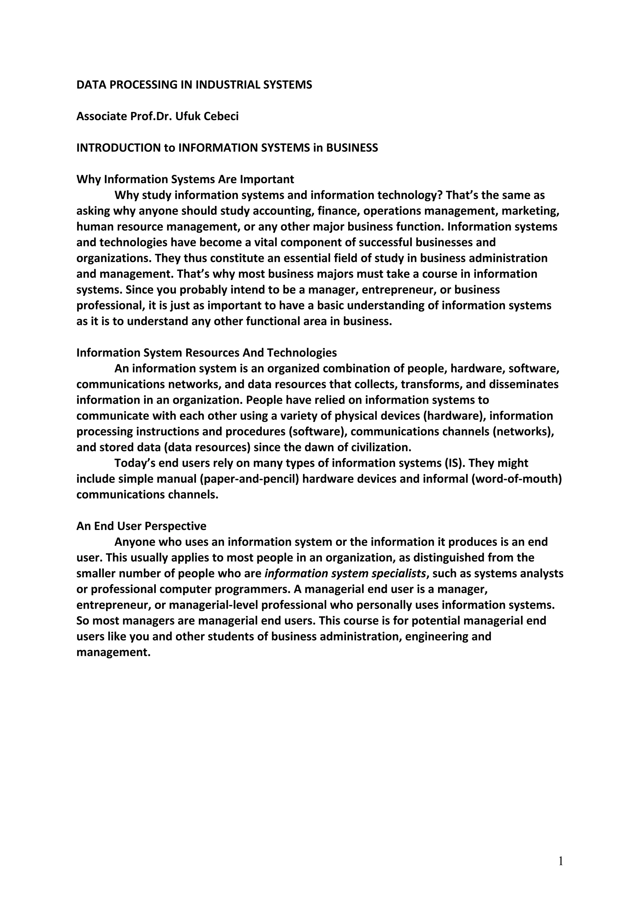 This document provides an overview of information systems concepts. It defines an information system as an organized combination of people, hardware, software, communications networks, and data resources that collects, transforms, and disseminates information in an organization. The document discusses the five basic components of information systems - people resources, hardware resources, software resources, data resources, and network resources. It explains that data resources are transformed through information processing activities like input, processing, output, storage and control into various information products for end users.