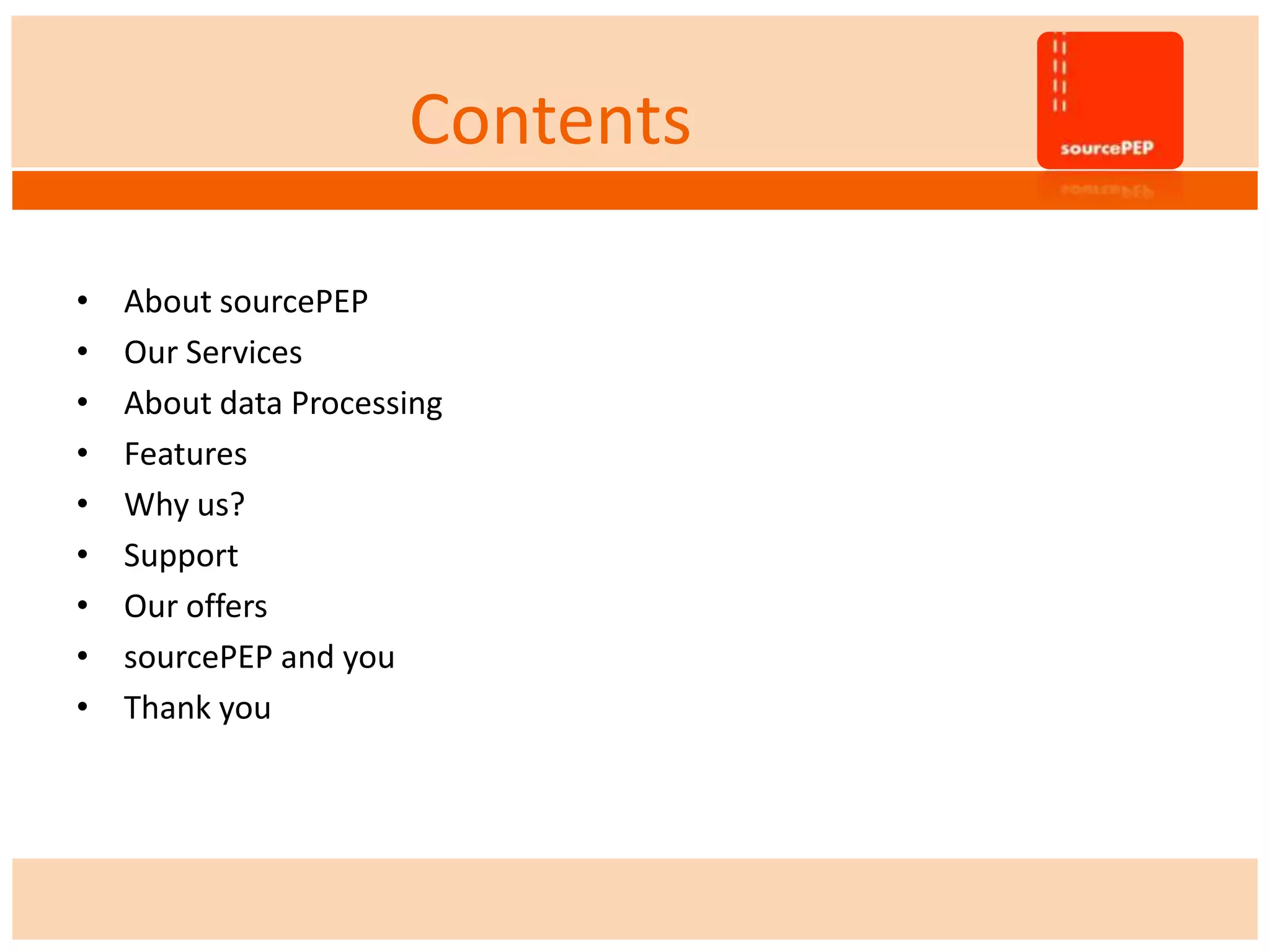 Sourcepep offers IT-enabled outsourcing solutions for small businesses based in Pune, India, focusing on services like data entry, processing, cleansing, and conversion. The company emphasizes quality support, commitment to customer satisfaction, and cost reductions, with a customer-centric approach to service delivery. Their services aim to improve efficiency, accuracy, and competitive advantage for clients while maintaining strict data privacy and security.